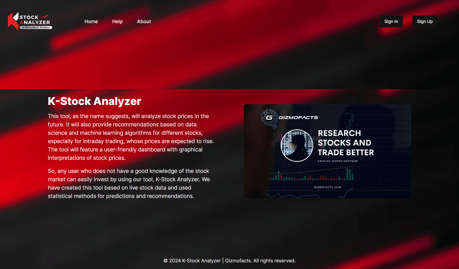 The KStockAnalyzer Full-Stack Next.js TypeScript Project, a product of Gizmofacts, seamlessly integrates the frontend and backend components to deliver a comprehensive stock analysis platform. With a user-friendly interface, real-time data, and Stripe subscription integration, it empowers users to make informed decisions confidently.